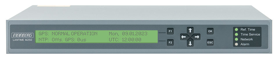 大型LC ディスプレイは、内部GPSレシーバとNTPサブシステムの状態を表示します。3つの LED (グリーン・レッド)は、3つの主要コンポーネント、参照時間(GPS)、時間同期サービス(NTP)、ネットワーク(Link status)の状態を表示します。4番目の赤色LEDは、ALARMランプであり、通知すべきすべてのイベントに表示をだすよう設定することができます。