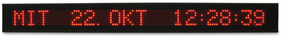 本大型ディスプレイVP100/20は、高さ50mmの、時刻、日付表示用のマトリクス・ディスプレイです。曜日、日、時、分、秒を20文字で表示が可能です。また、スタンド・アローン・クロック、DCF77受信機のクロックとしても利用できます。